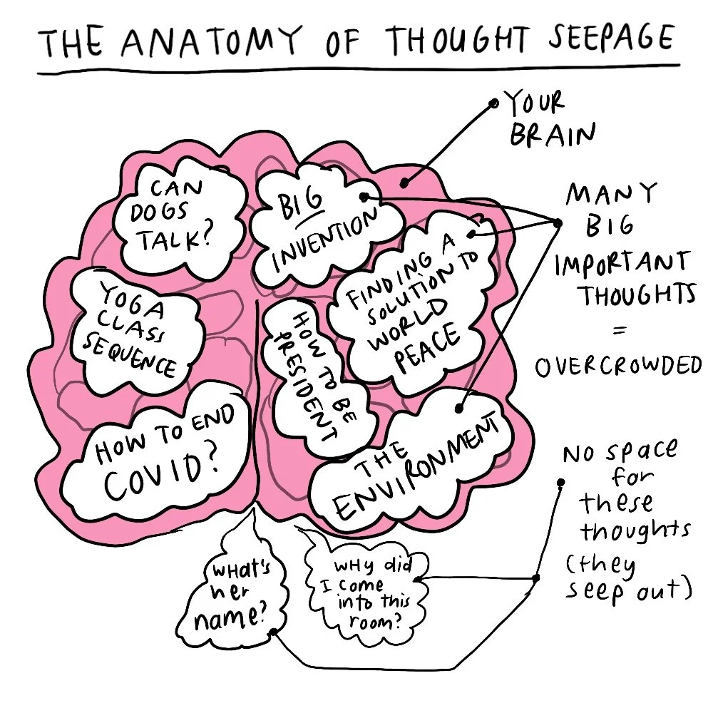 • Too many thoughts causes overcrowding of the cerebrum (cerebrum = one of the squidgy parts in the brain that does stuff).