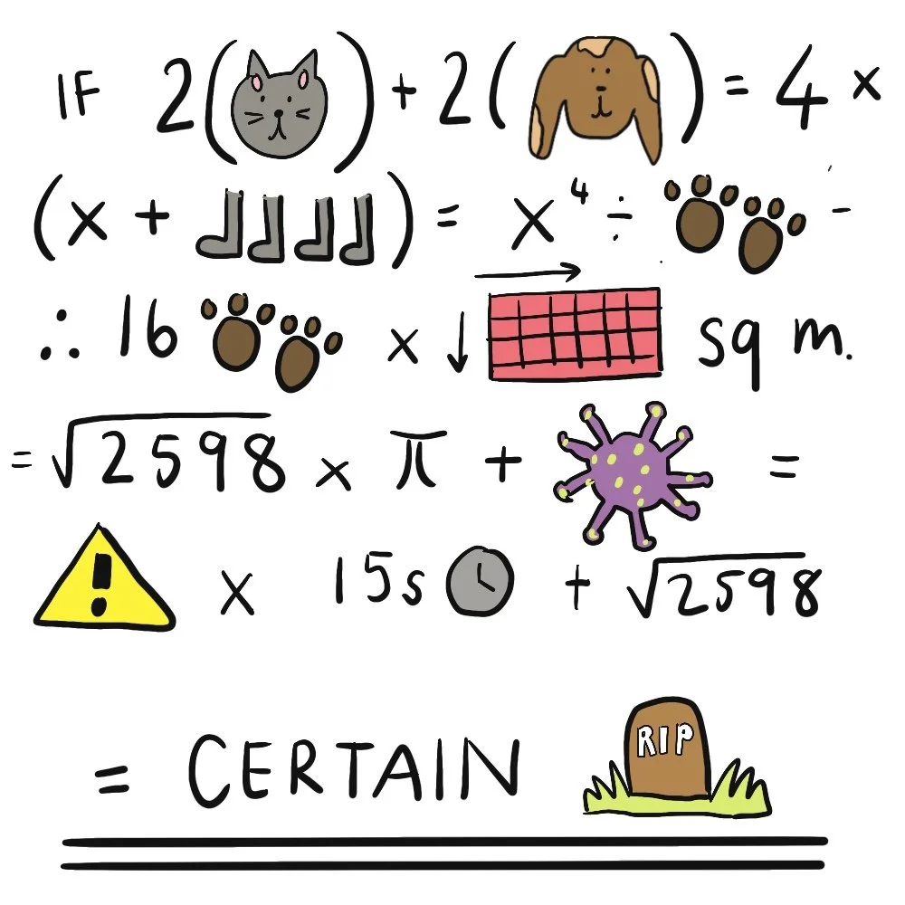 After deliberation with the ‘Elders’ (Elders= any family member or friend over 50 or Google) I realised that if the lurgy were to get me, it would be via my pets. The reasoning was 2 dogs and 2 cats are 16 paws, which can cover 1.7 m2 of floor space in 0.287 seconds.