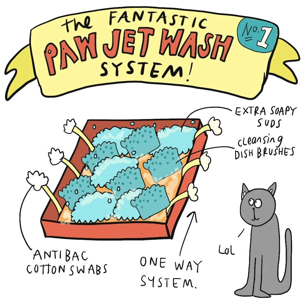 The Paw Jet Wash System. It ended up being a not so ingenious water filled, baking tray with 10 dish-brush heads stuck on the floor with random edges of cotton wool decorating the rim. The cats openly laughed at me as they jumped over the contraption.