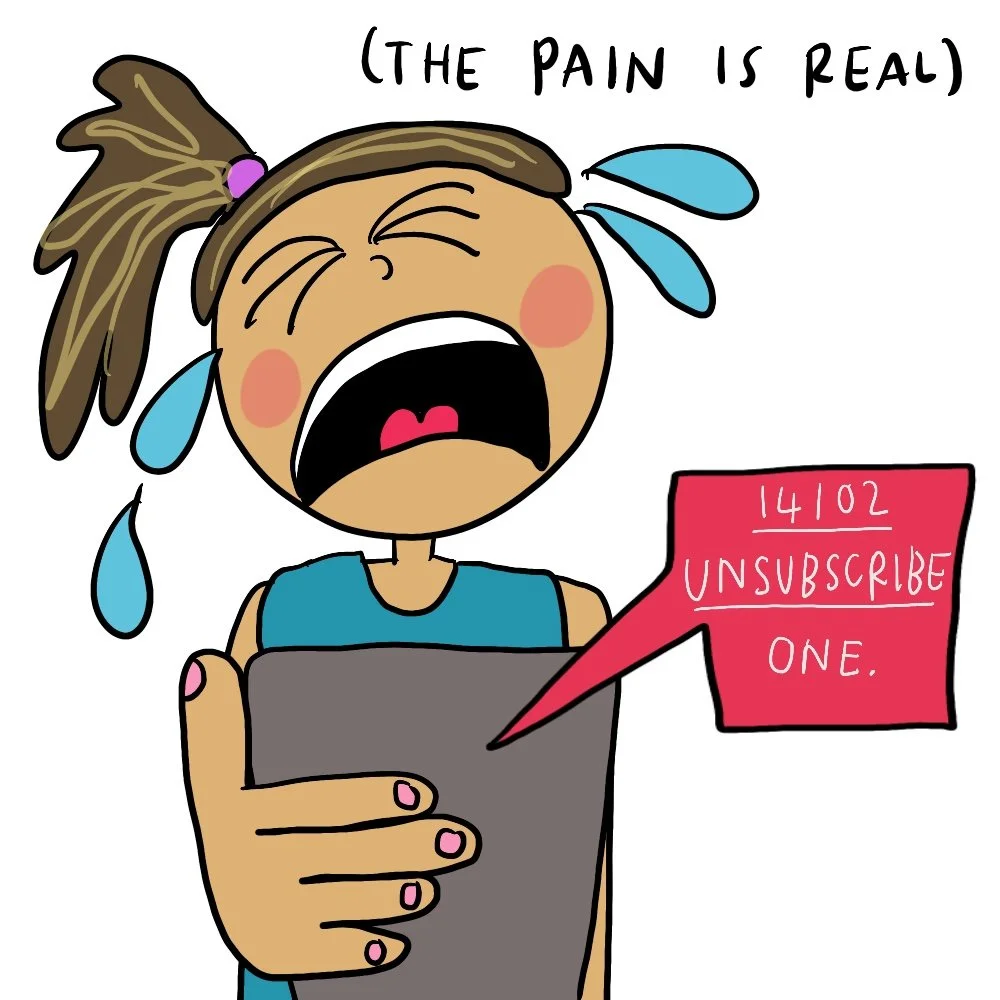 The irony that only last week I removed myself from twelve mailing lists because I felt irritated at not having time to read them, isn’t lost on me. Unsubscribing from OTHER people’s mailing lists is perfectly acceptable and even empowering, but not from mine.